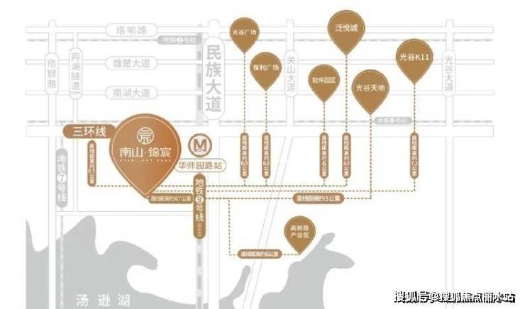 自驾:项目距离三环线比较近,从附近的华师园路可以连接民族大道,快速上三环,上三环后,就可以通往光谷、武昌、汉阳等核心区,沿民族大道可以直达光谷广场。