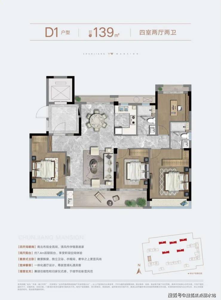 厅卧四朝南:穿过入户玄关,信步餐客厅,用心考量的生活美学,已在敞阔的空间等候多时;约14.2m大面宽,迎风光入室;约7.4m宽景阳台,多元灵动规划;