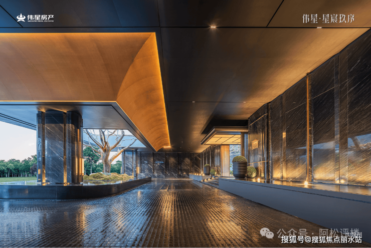 一个项目品质感的直接表达方式之一,一定是小区大门。伟星星宸玖序南侧大门宽约76米、高约7米,配置甚至超过了部分顶豪项目的标准。