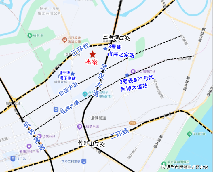 项目位于健康街与健身路交汇处,属于江岸区后湖板块,是整个大汉口站位较高的区域,同时项目东边临近武汉大道。