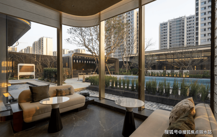 区别于市面上常见的和室外一体化设计,绿城云咏明月则考虑到了冬季的寒风和夏日的高温,进行了局部封闭设计,搭配大面的落地玻璃窗,设计出一个会客厅,业主可以和好友在这里一边喝茶,一边欣赏园林的流水和绿树。