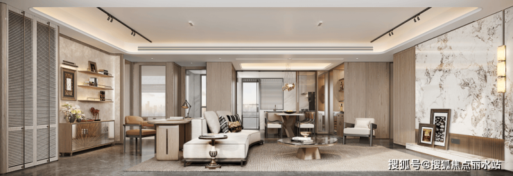 客厅:开放式的空间是全家的核心共享空间,巧妙融合了客厅、书房、餐厅与厨房区域,营造出通透而流畅的空间体验。温暖雅致的米色与木质棕构成主色调,与白色大理石纹理墙面相得益彰,既满足了现代生活方式,又通过精美的材质碰撞增添美学层次感。