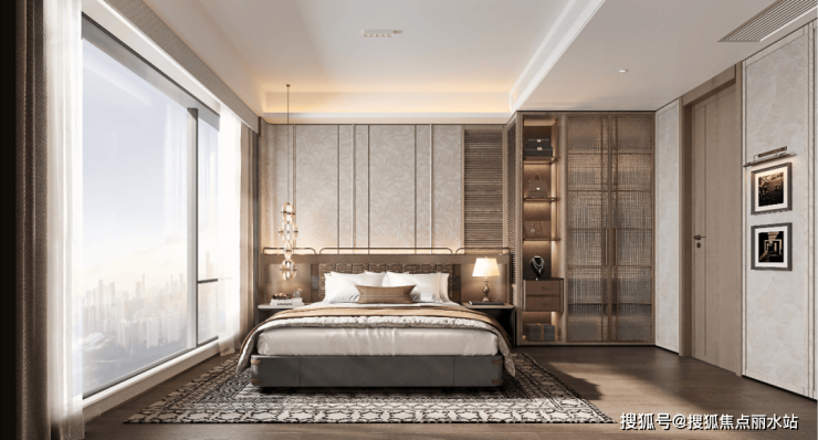 主卧:卧室空间,以材质对话与光影叙事为设计精髓,通过米色、棕色与金色的典雅配色,营造出温馨而不失奢华的休憩空间。