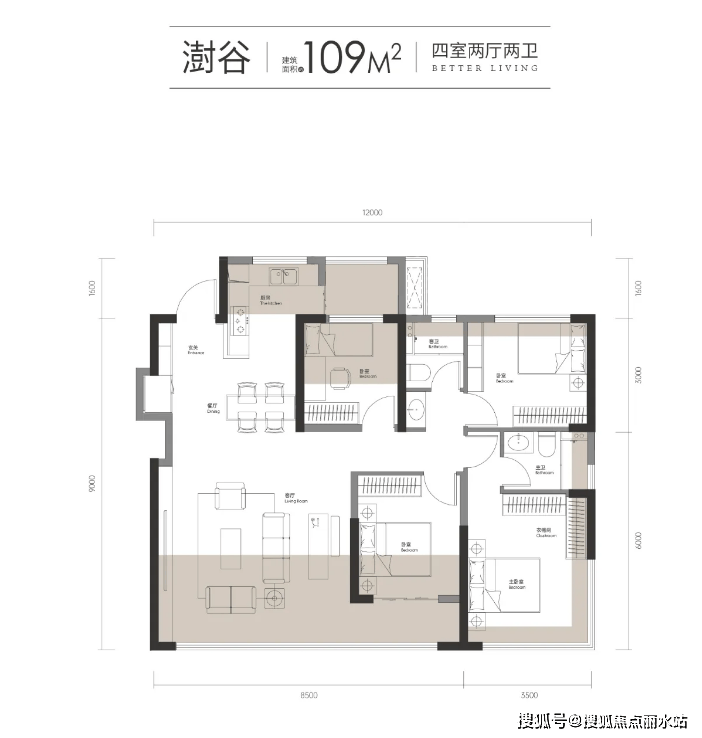 建面约109㎡,横厅四房+两厅两卫,客厅开间达到5.5米;