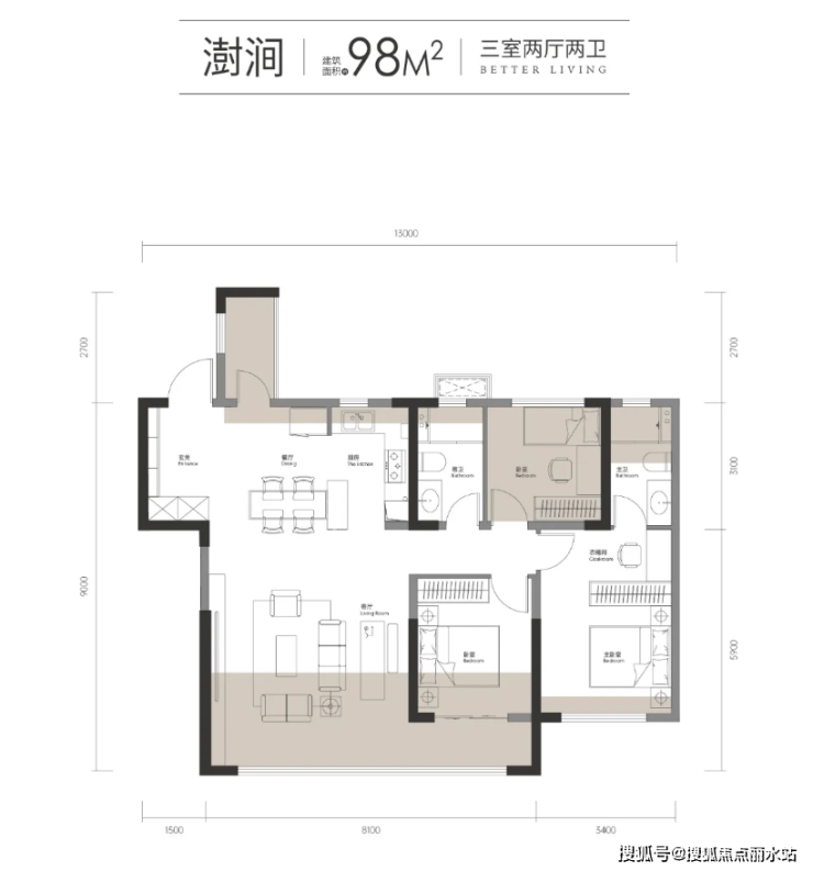 建面98㎡,能做3.5房+两厅两卫,客厅开间达到5.1米;