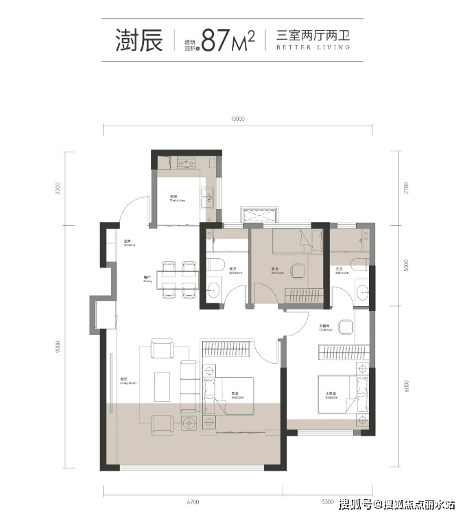 建面88㎡,做完整三房两厅两卫;