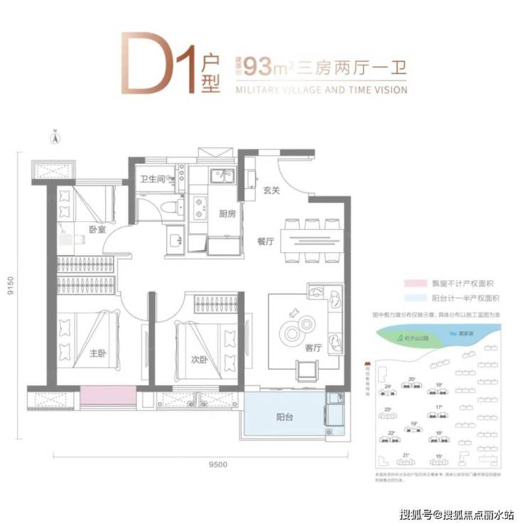 D1户型建面约90-93平,三房两厅一卫: