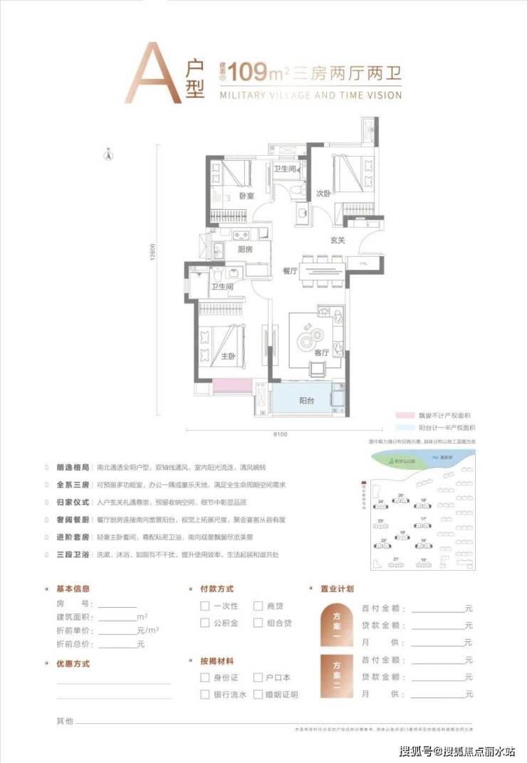 A户型建面约109-113平,三房两厅两卫: