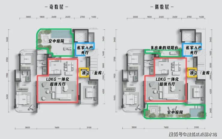 都有约6.3米的庭院挑高,露台+阳台总面积都在30平上下,都预留约50cm覆土深度,都与室内公区深度结合,客/餐厅得到延伸,自然又流淌进家庭生活的日常。