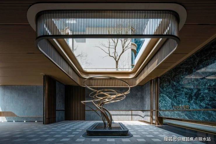 光又重新升起的天窗处,是中央润府的自由艺术走廊,交付后,这里会成为园区入口之一。地面三种颜色做格纹铺装,顶面则是古铜色不锈钢铝板,材质毫不含糊,但妙笔更在于悬在天窗下的四面格栅,垂下的格栅像灯蔓,也似空中屏风,园景与光线在这若即若离、若隐若现中增一份美感。