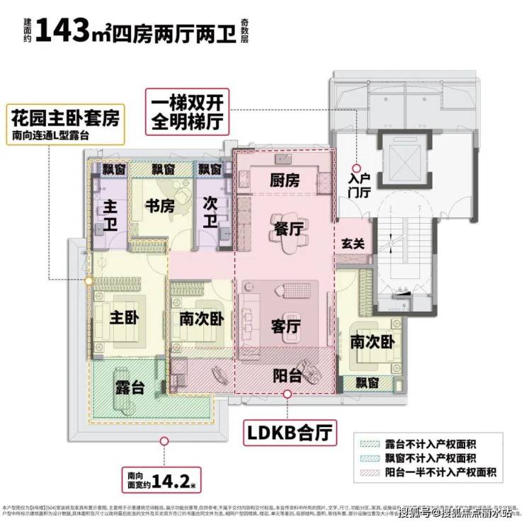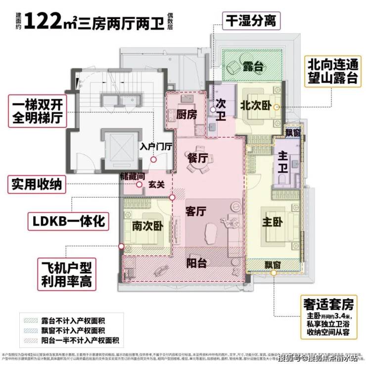 一梯双开+全明梯厅,归家从容私密。洋房得房率本就高,飘窗、挑空平台、阳台一半等均不计入产权面积,使用率超高,同时又是飞机户型,格局方正,无空间浪费。