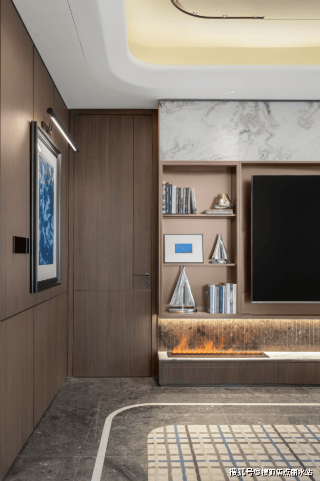 入户大堂墙面、地面都采用的是奢石铺设,再搭配落地窗前的休闲区以及墙面内嵌式景观点缀,格调十足。