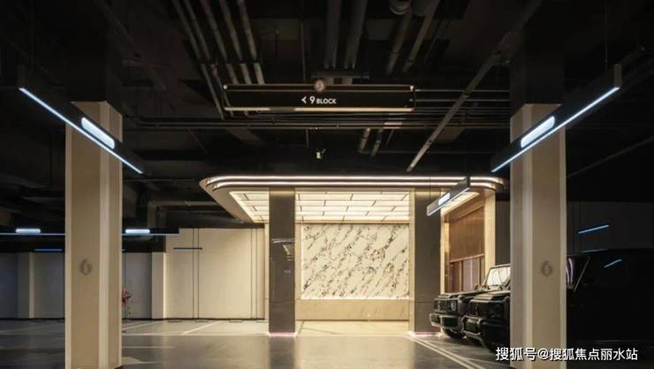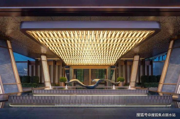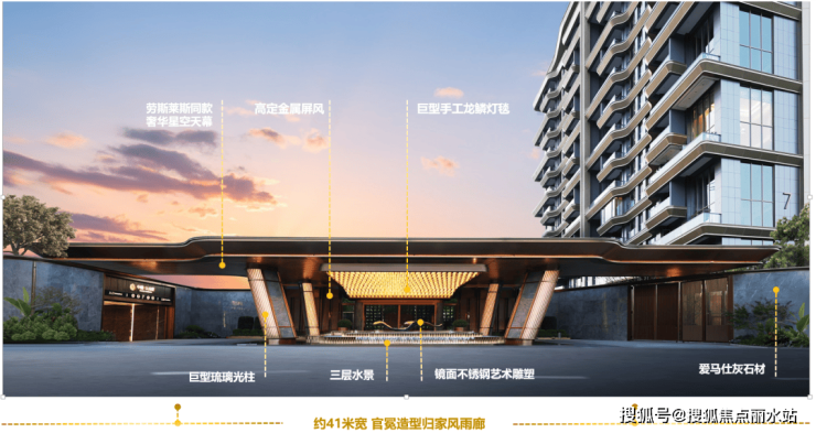 大门的顶部设计了劳斯莱斯同款奢华星空天幕,两侧是爱马仕灰石材墙面,中间设计为三层水景,入口两侧石柱精选的奢石为巴西皇家翡翠。