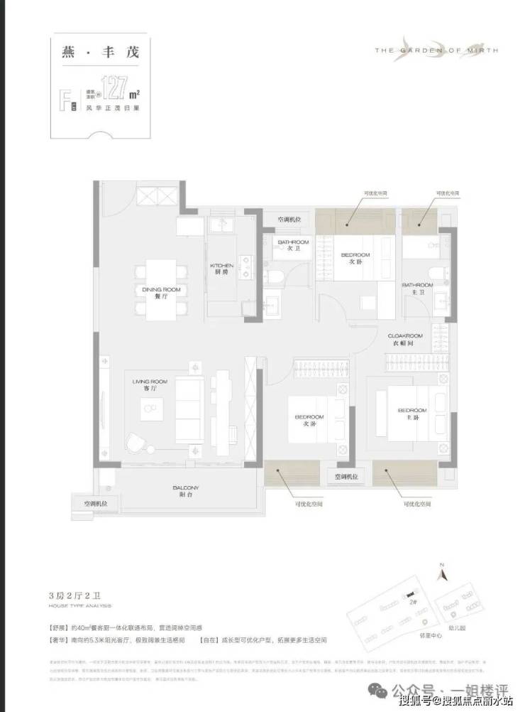 建面约127平的边套带有大方厅,是阔绰大三房两卫户型,还能变成3+1房,是改善置业的标配。