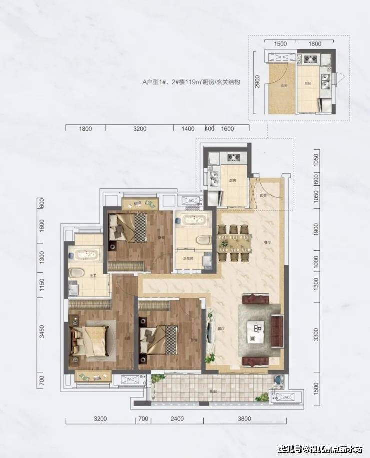 该户型为3号楼的边户,这个户型三面采光,布局合理,三个房间安置在房子的三个角落,相互不干扰,私密性极强;房间没有多余的走廊浪费面积,空间使用率高;三个房间都带飘窗,主卧套房设计,两个次卧空间也很阔绰,居住舒适性很高。