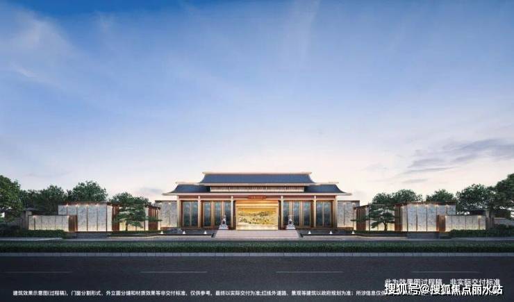 立面形制以借鉴宋皇室《仙山楼阁图》《瑞鹤图》中建筑要素为灵感,并以沧浪亭中明道堂为基础。采用重檐坡屋顶,五间一启形制,庄重不失克制。七阶入门,象征尊贵寓意圆满。门楣大师墨宝,门内非遗漆画姑苏繁华图,再现金阊的富贵之景。