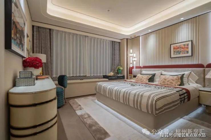 主卧套房更是整户型的点睛之笔。配备270°观景飘窗,将室内外景致最大化引入,既增强了空间的轻盈感,也提升了整体的居住品味。明卫设计进一步强化了通透与雅致并存的体验。