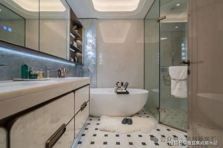 立面选用贝母白铝板,搭配劳斯莱斯同款香槟金色金属线条,再结合瀑布式“水晶灰”全景玻璃幕墙,不仅极大提升了室内采光与视野开阔度,更以灵动的天际轮廓,与杭州特有的江河韵味相融合,呈现出高级而耐看的建筑表情。