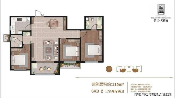 115平米:三室两厅两卫中户,四阳面户型,客厅大阳台