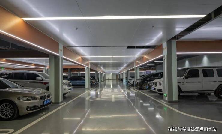 地库采用造价十倍于普通工艺的环氧磨石地坪,一体化浇筑的标识系统与铝板吊顶尽显奢华,车位均作加宽处理,方便户主停车。