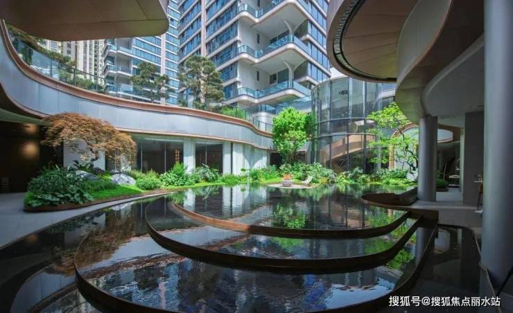 在景观设计上,近50米宽6米高的恢弘入口大门与近万平米中央景观轴相呼应,通过台地式下沉设计营造出丰富的空间层次。