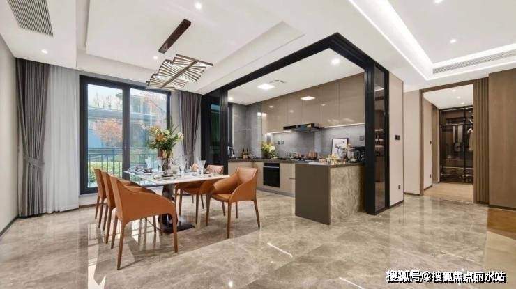 无缝连接景观阳台,为生活空间延伸。厨房、餐厅、客厅一体化进阶设计,配备270°大尺度转角观景飘窗,实现观景“头等舱”。