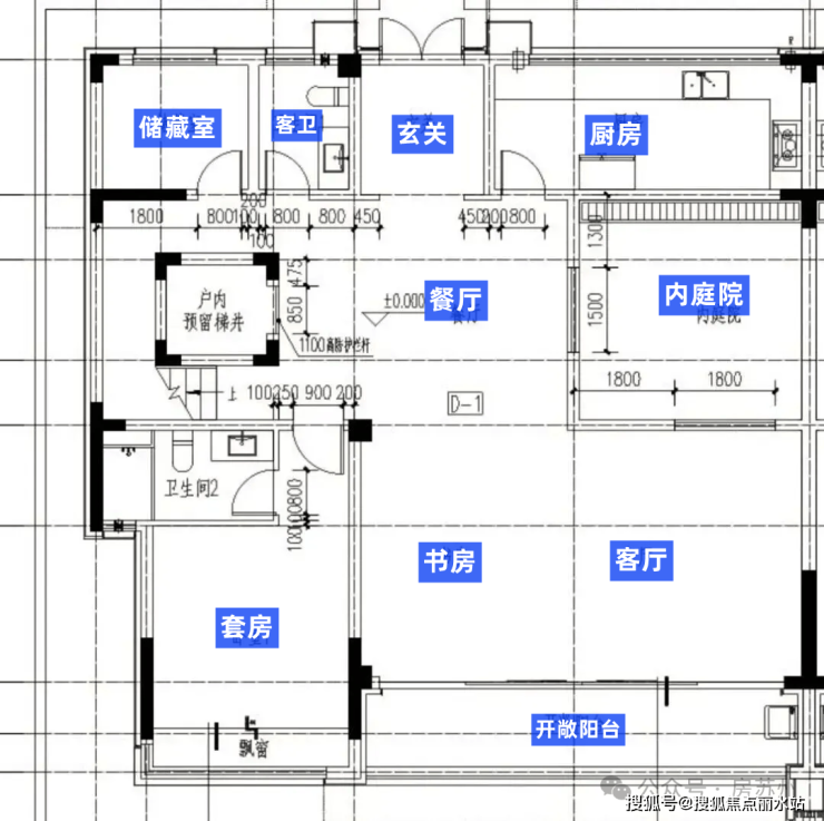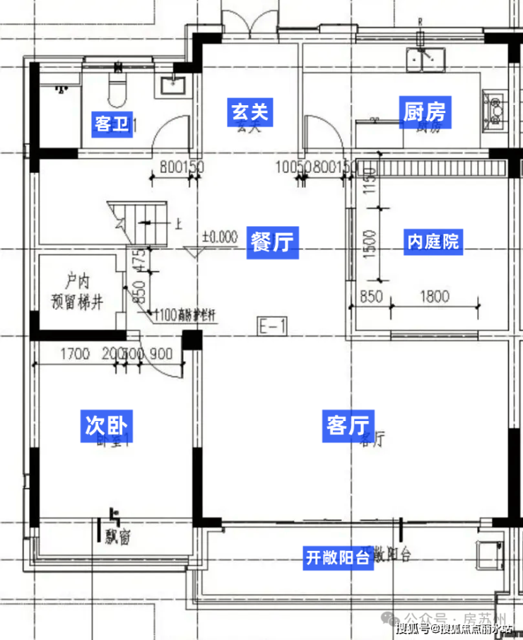 这个户型相对小一点,以东西边户为例,一层配置餐客厅、厨房、次卫、次卧以及内庭院等。