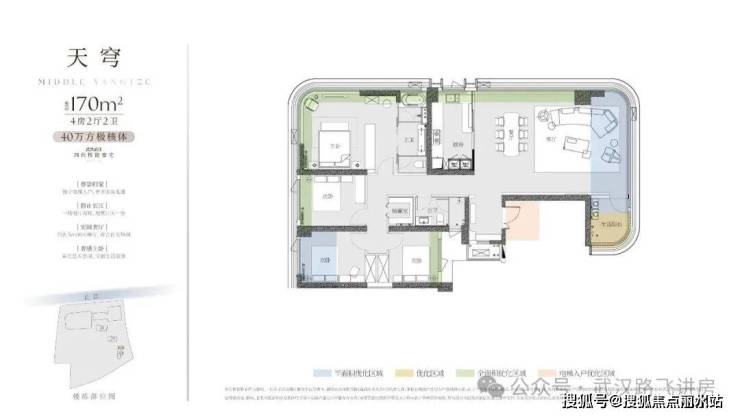 ③170㎡户型:四房两厅两卫,整个户型的布局与江面基本平行了,对比3号楼另外两个户型,170平户型的看江效果要优秀不少,客厅(270度观景)、主卧、主卫、厨房这几处空间都拥有不错的江景视野,观景面还是比较可观的。不过为了看江,这个户型的进深做的比较大,通透性稍显不足。