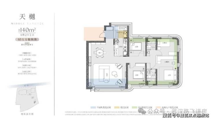 ②140㎡户型:四房两厅两卫,该户型南北通透、三开间朝南;因为3号楼的楼栋朝向、位置,属于北向看江,因此,这一户型的北面房间——次卧、儿童房拥有还不错的看江视野(中高楼层以上房源)。客厅空间相当的开阔,动静分区做的也比较好。