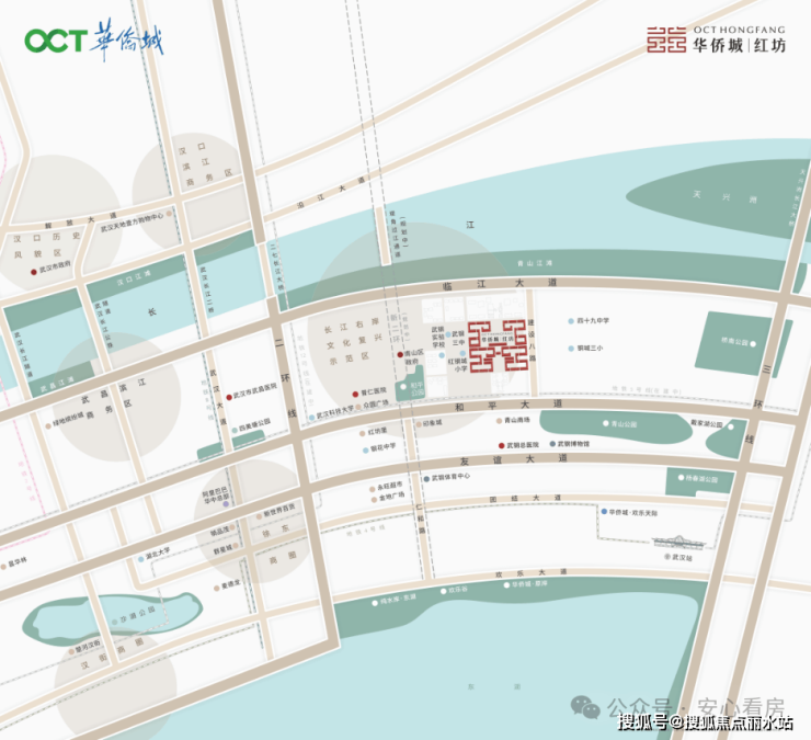 项目周边江滩公园、和平公园、青山公园、武昌生态文化长廊、戴家湖公园环簇,并与内部多主题公园串联,实现了华侨城“公园伴你回家路”的生态理念。