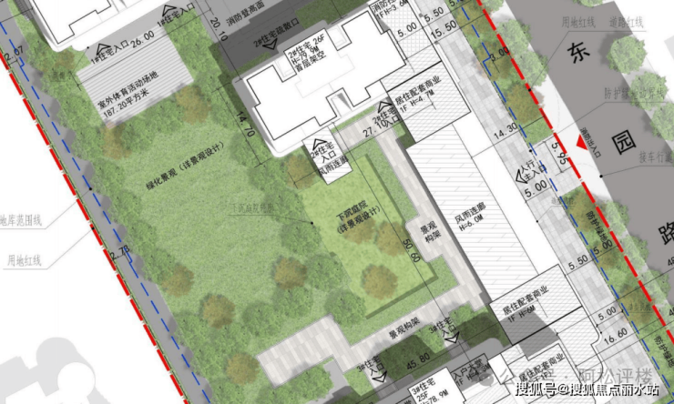 从平面图来看,3栋住宅为南偏东朝向,朝向与光谷创业街平行。主入口位于东侧关东园路,地块东北侧、西南侧分布有地库入口。1、2号楼首层架空,3号楼首层为物业用房。