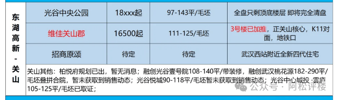 光谷核心区域在售楼盘及货量已经很少了。项目较近光谷一路的光谷中央公园目前已在清盘,成交价基本保持在约1.8-1.9万/平左右,清盘价有低至16XXX元/平起的,华润品牌开发,紧临光谷八小。该项目的价格对于本案来说,参考价值更大。毕竟又过了一年,整体楼市行情又下降了不少。