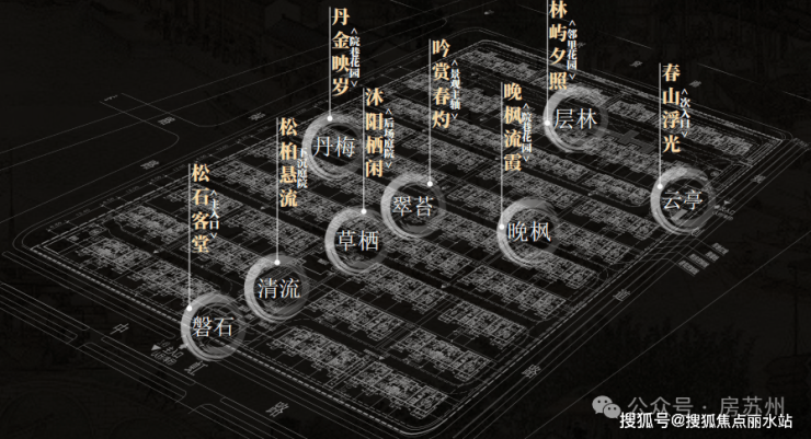 8大景观节点:营造可行、可观、可游、可居的东方诗意天地。①松石客堂-主入口;②松桕悬流-下沉庭院;③沐阳栖闲-后场庭院;④吟赏春灼-景观主轴;⑤丹金映岁-院巷花园;⑥晚枫流霞-院巷花园;⑦林屿夕照-邻里花园;⑧春山浮光-次入口