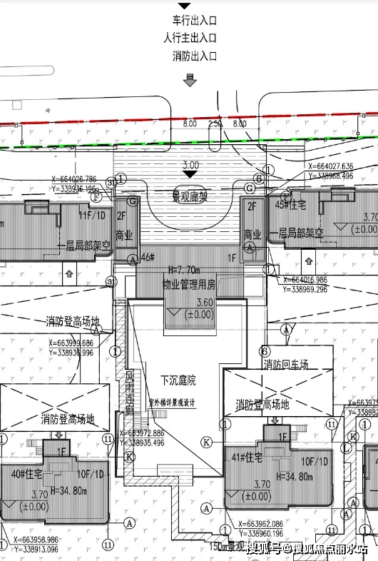 项目在北侧金鸡湖大道以及西侧规划道路设置有双入口。其中北侧金鸡湖大道为主入口,主入口结合物业配套用房,以及设置有下沉庭院,预计项目未来将在这里重金打造项目的售示样展示区。