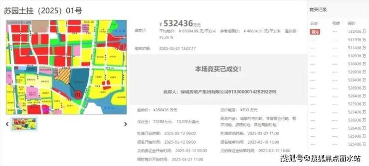今年3月21日土拍中,绿城在历时2小时,竞价182轮之后,成功以总价约53.24亿竞得,成交楼面价40684元/m²,溢价率45.3%!直接登顶园区近5年溢价王、近9年总价王!
