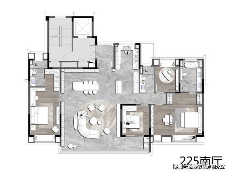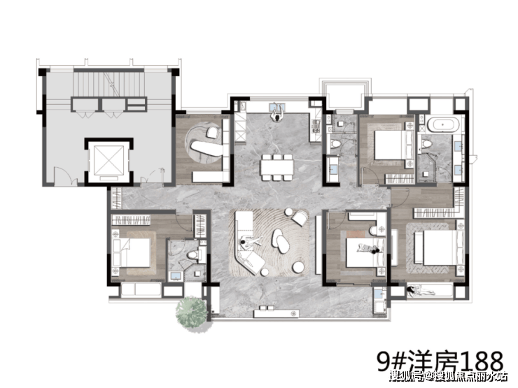 再看几个房间的设置分布,双套房的设计,父母套房和主人套房在全部享受良好的通风采光下,是分开互不干扰的,又能满足照顾老人的居住需求,规避了一房三代同堂的困扰。