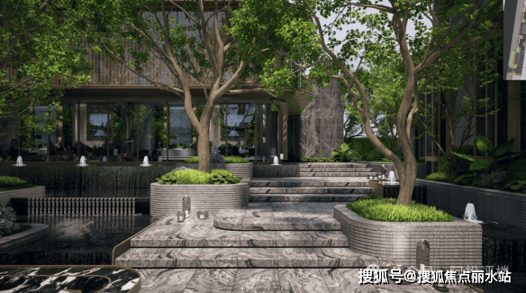 规划三重五景的园林,绿植、艺术装置、水景交叠。