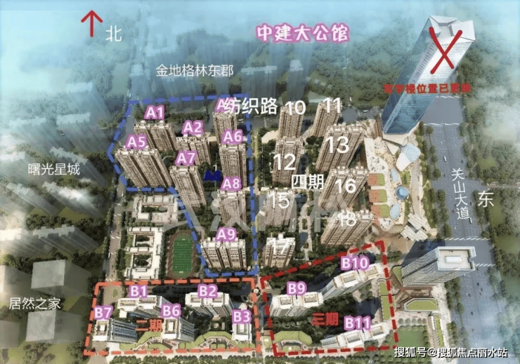 住宅部分分四期开发,前面三期(虚线框出的地块)已全部售罄。