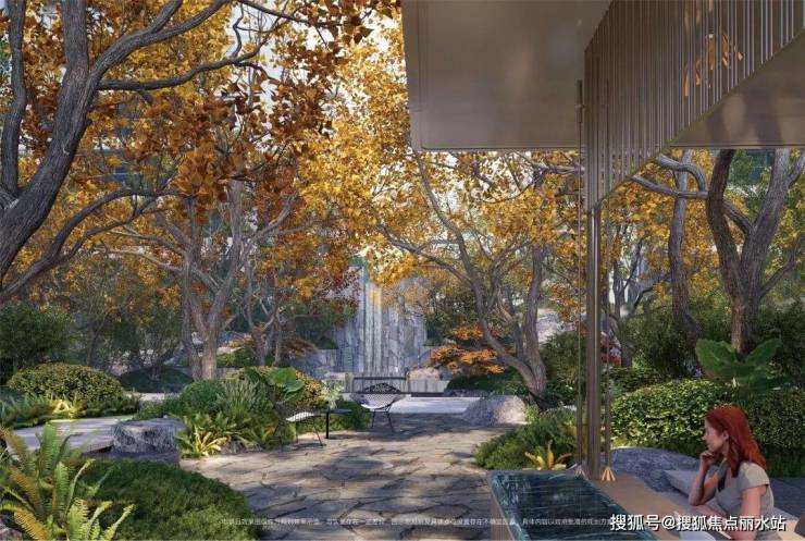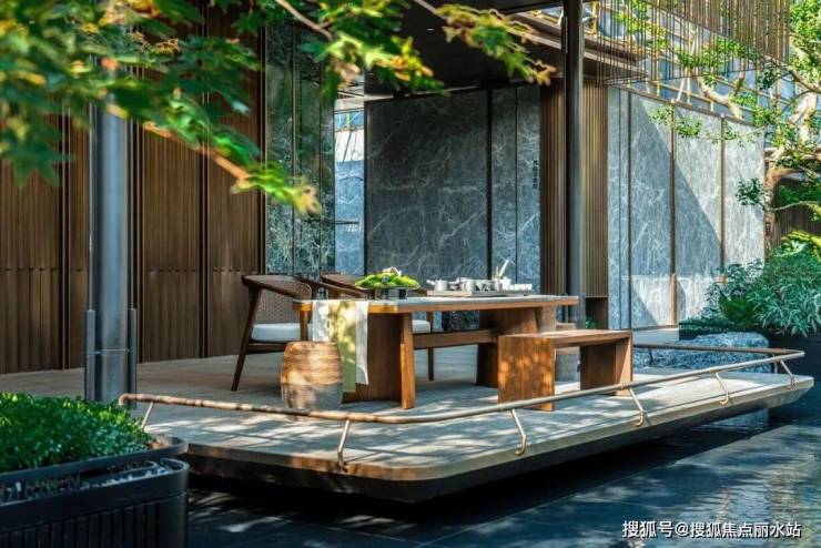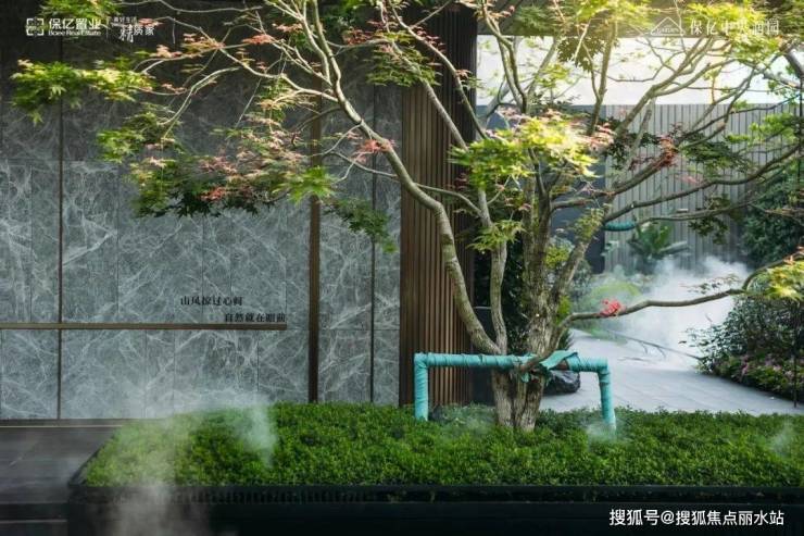 福鼎黑仿石点缀古朴黑山石,大气而贵重的第一视角,进口意大利的普拉达绿大理石打造山石叠瀑,搭配名贵罗汉松及红枫蜜桔,兼顾层次与隐奢气场。