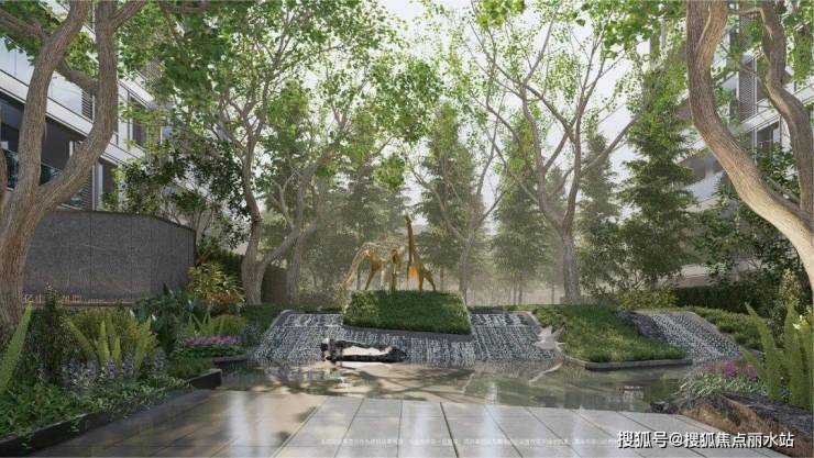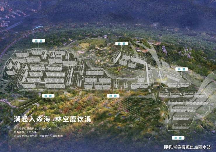 以“林空鹿饮溪”诗词为意境灵感,规划“一轴三厅四园”园林景观。