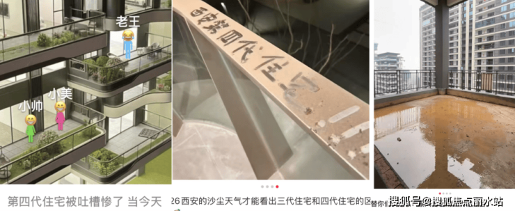 这几年,随着空中庭院的广泛应用,来自全国各地的业主吐槽也随之而来。不仅有网友吐槽空中庭院在南方就是“老王的逃生通道”,在北方就是“老婆的专属冰柜”,而且还有西安、成都等地的业主“现身说法”,将暴风雨之后的图片发到了社交平台,吐槽四代住宅“下雨成汪洋,刮风成沙滩”,实用性太差。