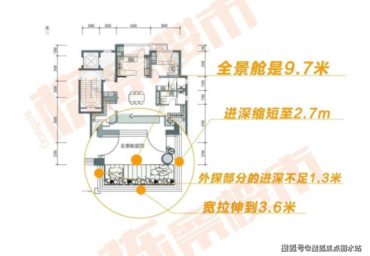以万科雲樾127平偶数层产品为例,这个户型是“三叶草”格局,全景舱空中庭院设计在了户型的东南角,万科雲樾通过”宽面短探”的设计手法,将9.7平全景舱的面宽拉伸到了3.6米,进深缩短至2.7m,外探部分的进深不足1.3米,让全景舱在总面积不变的前提下,“短”了一截,这样既保证了空中庭院的大空间和全景视野,又保证了楼下的采光效果。另外,这个户型,设计了双跑道阳台,连通两个卧室及客厅空间,保证主要起居空间均有充足采光。通俗点儿说就是,这个户型用一个不到1.3m的“小帽檐儿”,换来一个将近10㎡的全景舱空间,这个设计值不值,显然智者见智。
