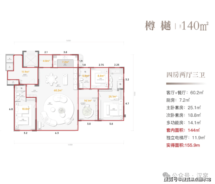 四开间朝南,南向开窗面超过16米,客厅开间约6米,连通餐厅一起,面积达50多平。
