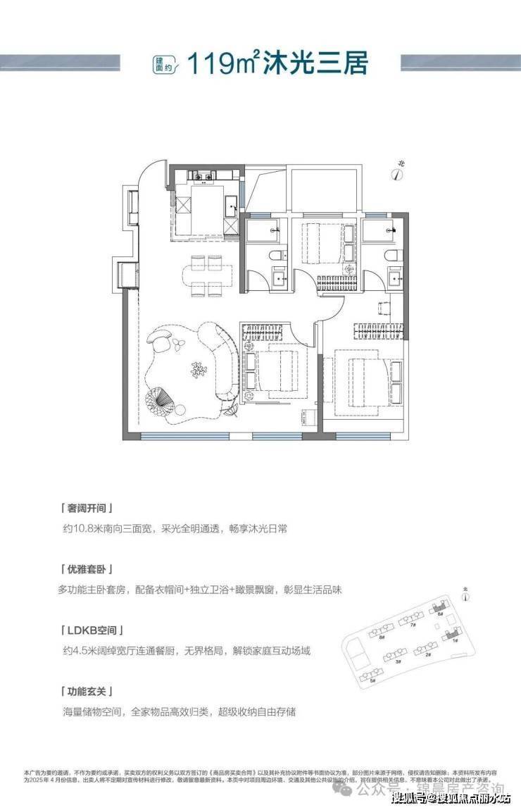 119㎡三居:创新S型收纳墙隐藏储物空间;南向约10.8米三面宽落地窗 + 7.5米连通式观景阳台,最大化阳光采光。