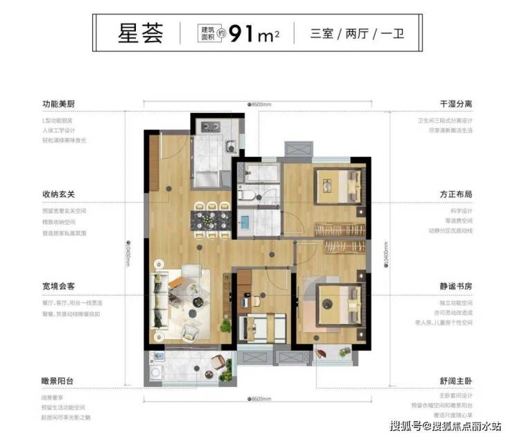 建筑面积约91平方米户型,三室两厅一卫,南北通透,户型方正,三开间朝南。理想0浪费三房设计,实用和美观兼得,创建出更大更完整的使用感,同时保证居住私密性和便利性。