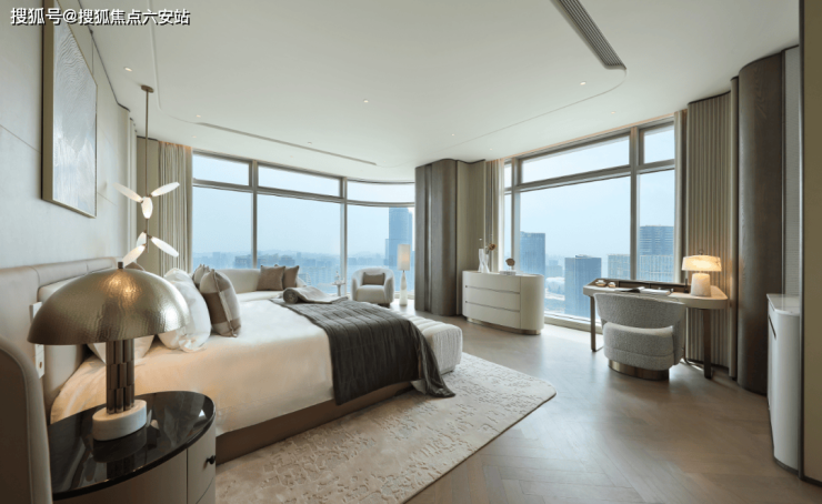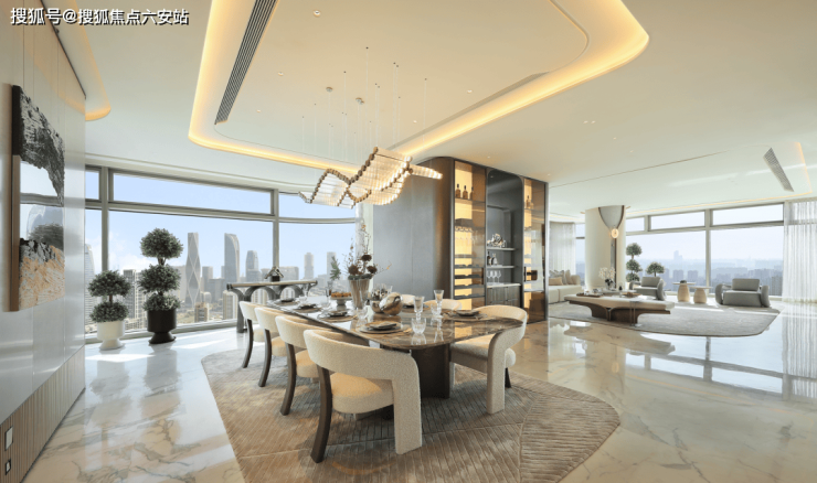 表现在商业大户型上,超93%的得房率,远超行业平均水平,让每一寸空间都物尽其用。约24米的巨幕落地窗将城市景观毫无保留地引入室内,双夹胶四层超白弧形水晶玻璃兼顾了美学与功能性,有效隔绝紫外线与噪音,强化地标的艺术感与辨识度。超大中央岛台的设计借鉴了美式别墅的布局,重新定义了家庭社交中心,进一步拓展了家庭互动场景边界。