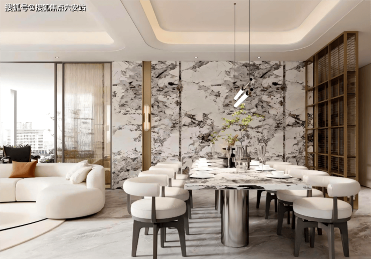 餐厅与客厅空间相贯连,开阔的视野带来惬意与更具互动感的用餐氛围。精巧工艺与大理石水墨画般的自然纹理交相叠映,镜面光泽,熠熠生辉,每一处细节都彰显着对品质生活的极致追求。