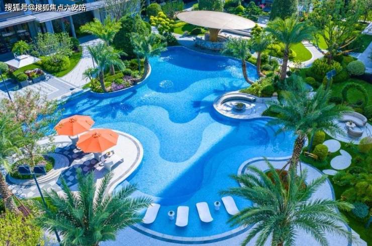 穿门而入,迎宾水院的风景很美,曲径通幽,步移景异。更亮眼的还有异形“蓝宝石”戏水池。