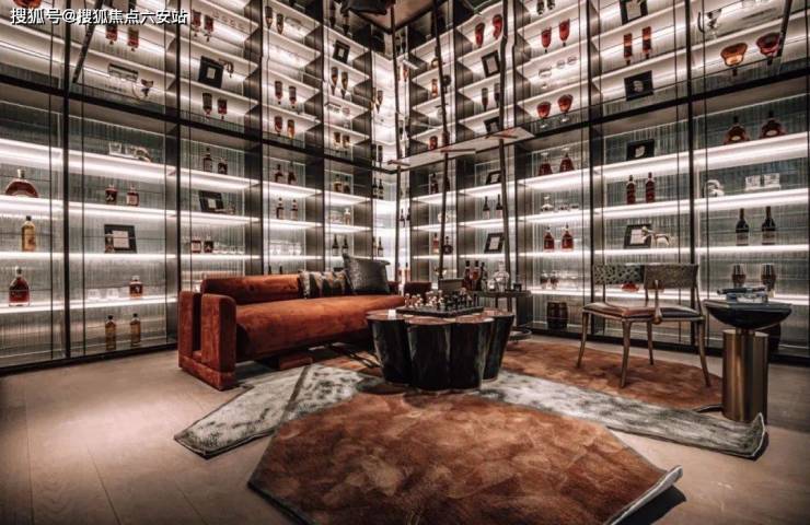 从静心凝神的茶室走几步,就到了藏酒饮酒的开放式会客空间,墙上橱柜码着主人从各处精心搜罗回来的上等佳酿。