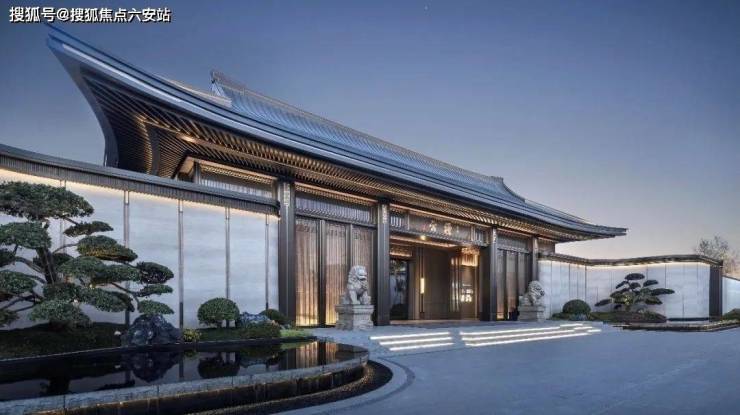 迎面是主入口约59米宽、12米高的新中式大门,九脊歇山顶大气尊贵,两株罗汉松分列左右,一眼望去气势恢宏。